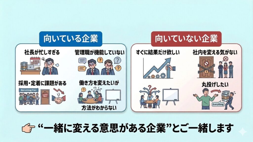 人事コンサルは制度設計に強くても運用が続かず、ITコンサルはツール導入ができても組織や働き方の変化まで踏み込めないことがあります。
